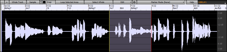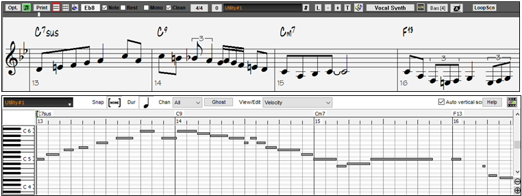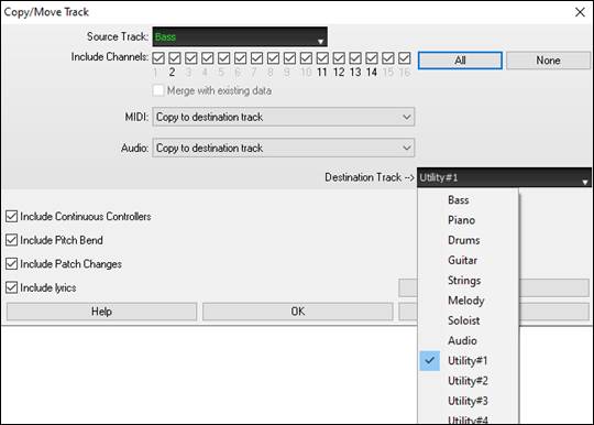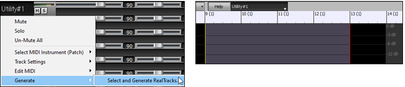 There are 16 new editable Utility tracks, which can be used for audio and/or MIDI. You can generate RealTracks on the Utility tracks, where you can hear and edit the audio RealTracks, or view and edit the RealCharts MIDI. You can record audio or import an audio file to the Utility tracks to play, edit, or harmonize the audio. You can copy or move audio, MIDI, or both from other tracks to the Utility tracks. You can record MIDI or import a MIDI file to the Utility tracks for playback, notation display, or editing.