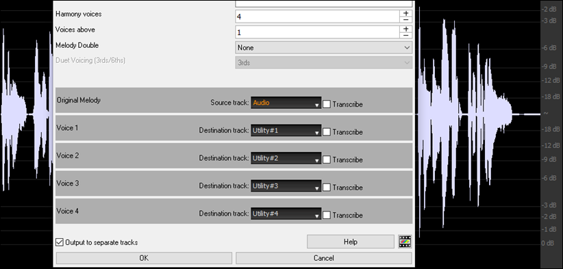 You can harmonize the audio on any track, and send the separated harmonies to the Utility tracks. In the Audio Edit window, press the [Edit] button, and select Harmonize from the menu to open the Audio Harmonies dialog. Then, set the number of harmony voices and other options, select the source track, enable the “Output to separate tracks” option, and select destination tracks for each harmony voice.
