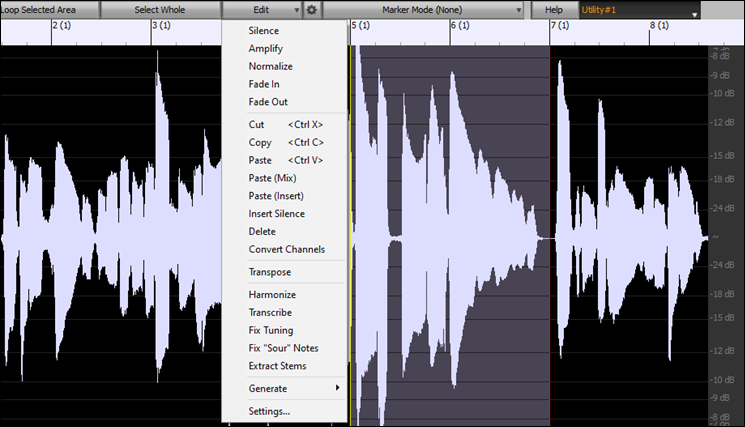 The audio on the Utility tracks can be edited in the Audio Edit window with the [Edit] button menu, the right-click menu, or the standard hotkeys like Ctrl+C, Ctrl+V, etc. For example, you can highlight a region and move it to another location of the track, or you can select the whole track, copy it, and paste it into another Utility track. When the regions are edited, the beginning and ending of the regions cross-fade to make a smooth transition, so you won’t hear unpleasant clicks or pops at the joints during playback.