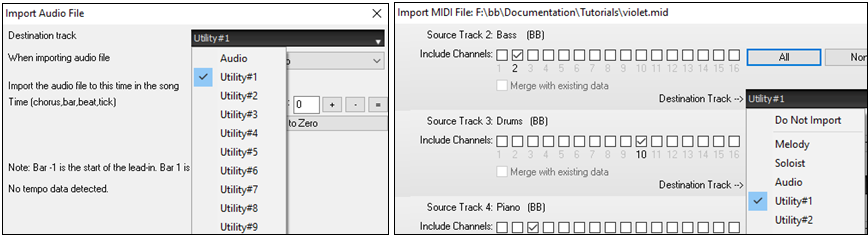 You can import an audio or MIDI file to a Utility track. Drag a file and drop it anywhere on the Band-in-a-Box screen, and when the Import dialog opens, select a Utility track as the destination.