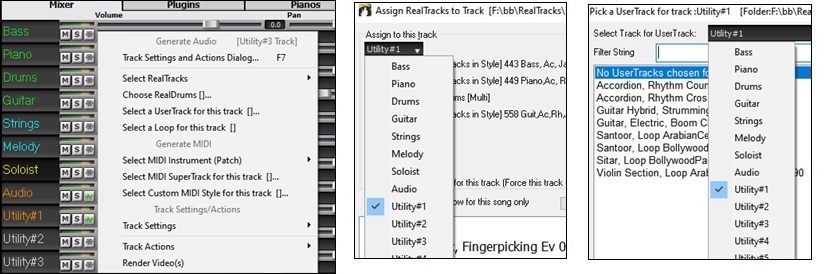 For example, when you click on a Utility track label in the Mixer, you will see a menu with settings and actions, which has always shown for the main tracks, so you can use it to generate RealTracks, RealDrums, MIDI SuperTracks, Loops, etc. on the Utility track. Also, in various track generation dialogs (RealTracks Picker, Loops Picker, MIDI SuperTracks Picker, etc.) the track selector now includes all 24 tracks to allow you to select any track within the dialog..