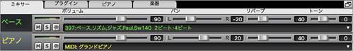 [ミキサー] のタブでは、ボリューム、パン、リバーブ、トーン、楽器名が表示されます。