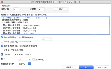 【コード・メロディー】フィルターボタンを押し、表示されるメニューから「現行ソングの指定範囲のコード進行に一致」を選択すると、現在開いているソングの指定範囲のコード進行と同じコード進行を持つソングを検索できます。ダイアログを開いたら、「範囲の指定」欄で開始小節と小節数を入力して範囲を指定します。【更新】ボタンを押すと、その範囲のコード進行がダイアログに表示されます。検索条件に、「キーが相対的に同じ」、「キーが同じ」、「コードのエクステンションが同じ」、「拍子が同じ」を加えることもできます。
