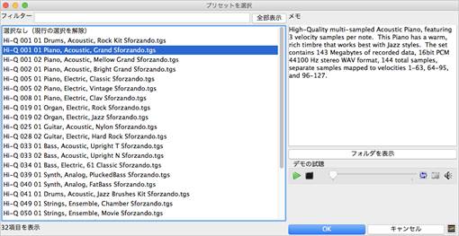 ソングを選んだら、 [OK] ボタンを押します。「選択時に演奏を始める」に有効にしておくと、このボタンを押すとすぐに演奏が開始します。