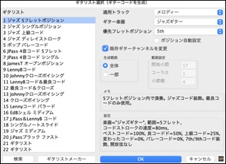 ツールバーの 【ギターコード自動生成】ボタンを押すか、ギターウィンドウの【ギターコード】ボタンを押してダイアログを開きます。
