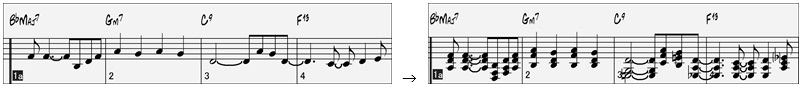 MIDIデータが入力されているメロディートラックまたはソロトラックトラックでは、単音を和声で置き換えることができます。
