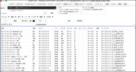 メロディストは、マルチピックライブラリ、またはメロディスト選択ダイアログで選択します。マルチピックライブラリは、オーディオデモの試聴、リストの並べ替え、メロディストに限らず全タイプの素材選択、より簡単な部分的生成機能等を備えており、さらに、ウィンドウを開いたまま他の作業を並行して行うことも可能なため、こちらのご利用を推奨します。