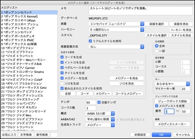 そして、メロディストを選択し、生成する要素(コード、メロディー、ソロ等)やその他のオプションを設定し、【OK】ボタンを押します。(注釈:メロディストは、このボタンを押した際にメロディーを生成します。ツールバーの【演奏(新伴奏)】ボタンや[F4]キーを押した際には生成しません。)