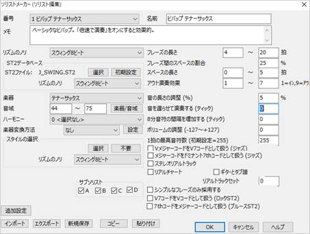 他のAで代理コードを使用する割合 通常、AABA形式のソングにおいてすべてのAの部分では同じコードが用いられますが、このオプションを0以外にすると、メロディーは保ったまま、それぞれのA部分で異なるコードが生成されます。(初期設定=0)