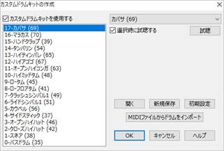 独自のドラムキットを作成するには、スタイルメニューの「ドラムキットの作成」を使ってダイアログを開きます。「カスタムドラムキットを使用する」を有効にし、ドラム楽器を選択します。 [MIDIファイルからドラムをインポート] ボタンを押すと指定のMIDIファイルからドラムをインポートすることができます。