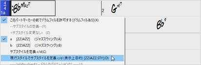 コードシートのパートマーカーを右クリックすると開くメニューに現行スタイルでサブスタイルc/dを定義するコマンドを加えました。従来のサブスタイルを定義するコマンドと似ていますが、この場合はスタイルピックは開かず、現行スタイルでc/dを定義します。スタイルを変えないで表示上の目的でサブスタイルc/dを定義する為の機能です。