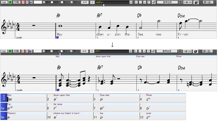 音符単位歌詞を小節単位歌詞に変換することができます。これは編集メニュー>歌詞>音符単位歌詞を小節単位歌詞に変換のコマンドを使って行います。音符単位歌詞はメロディートラックの個々の音符に対する歌詞の為、ノーテーションウィンドウの他のトラックやコードシートで見ることはできませんが、小節単位歌詞に書き換えるとノーテーションウィンドウのどのトラックでもコードシートでも見ることができます。