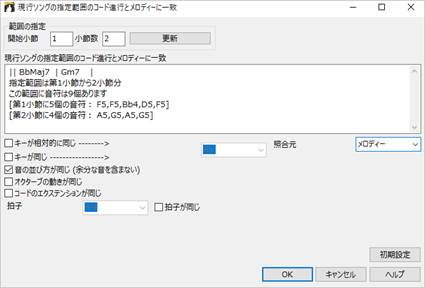 [コード・メロディー] フィルターボタンを押し、メニューの「現行ソングの指定範囲のコード進行に一致」を選択すると、現在開いているソングの指定範囲のコード進行と同じコード進行を持つソングを検索できます。ダイアログを開いたら、「範囲の指定」欄で開始小節と小節数を入力て範囲を指定します。【更新] ボタンを押すと、その範囲のコード進行がダイアログに表示されます。