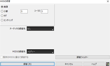 ツールバーの [MIDI録音] ボタンか [Ctrl]+[R] キーを押してダイアログを開きます。