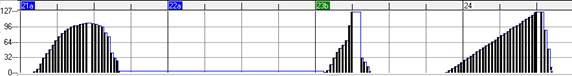 デモソング RollDemoSong.MGUの場合、エクスプレッションコントローラによって、イントロでオスティナートを演奏するフルートが徐々にボリュームを増した後、徐々に減っていくという効果が加えられています。このイベントはラインツールを使って入力しました。第4小節の途中でトランペットの演奏が開始する所で通常のボリュームに戻す為にエクスプレッションコントローラのイベントが1つ、127の値で設定されています。このような単一のコントローライベントを入力するには、希望位置にカーソルを置き、クリックします。