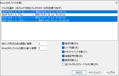 「トラックを選択」の欄にMusicXMLファイルに存在するトラックが表示されます。ここで、Band-in-a-Boxに開きたいものを選択します。複数を選択するには[Ctrl] キーを押しながらクリックします。MusicXMLファイルに含まれていても、この欄で選択されないトラックは開きませんのでご注意ください。