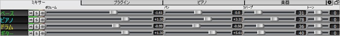 ウィザード共演にはスルートラックが使用されますので、楽器やボリューム等をミキサーウィンドウの「スルー」の欄で変更することができます。