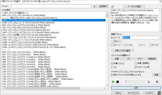 ウィンドウを開いたら、リアルトラックを割り当てるトラックを左上部で確認し、それに対するリアルトラックをリストから選択します。リスト内をダブルクリックしてオーディオデモを試聴したり、フィルター機能を使ったり、メモやジャンル等を参考にしながらリアルトラックを探したら、【生成】ボタンを押します。