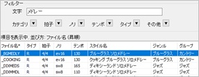 フィルター 指定の文字を含むリアルトラックを表示するには、文字を入力し、 [適用] ボタンを押します。 [#] ボタンを押すと、演奏タイプ(リズム/バック/ソロ)、リズムのノリ、テンポ、動画対応等でリストをフィルターすることができます。フィルターを解除するには [解除] ボタンを押します。