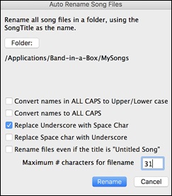 Auto Rename 8 Character song filenames will rename all song files in a folder using the song title as the name. The Auto Rename Song Files dialog will open. If you have a folder with files that are in the short filename format, you can quickly convert the filenames to long file names. Band-in-a-Box will use the title of the song as the file name, so if you have a file called OldFolk.mgu, Band-in-a-Box read the actual song title stored within the song and rename the filename to “Old Folks at Home.MGU.”