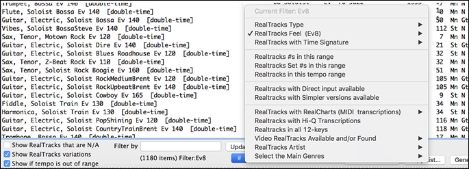 The style list can be filtered by a specific RealTracks/RealDrums/MIDI SuperTracks or RealTracks/MIDI SuperTracks in a certain number range. To use this feature, press the [Other] filter button in the StylePicker. If you want to find styles that use RealTracks #362, for example, select Styles that contain a specific RealTracks or MIDI SuperTracks from the menu.