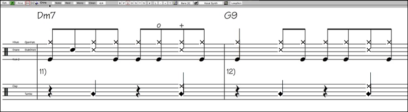 The drum notation shows on the Notation window, Lead Sheet window, and printout.