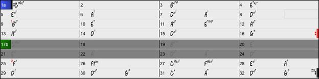 The location of the highlight cell determines where chords will be entered. Use either the mouse or the cursor arrow keys on the computer keyboard to move the chord highlight cell around the Chord Sheet.