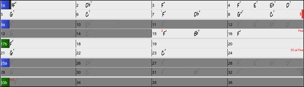 Open a demo song “Repeats Tutorial example 2 with 1st-2nd and DC al Fine” from the Band-in-a-Box/Tutorials/ Tutorial - Repeats and Endings folder.