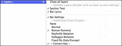 The “Additional Chord Display” layer shows the chords using the normal display or an alternative mode of showing root notes. There are four alternative modes: Roman Numeral, Nashville Notation, Solfeggio Notation, and Fixed Do (Italy/Europe).