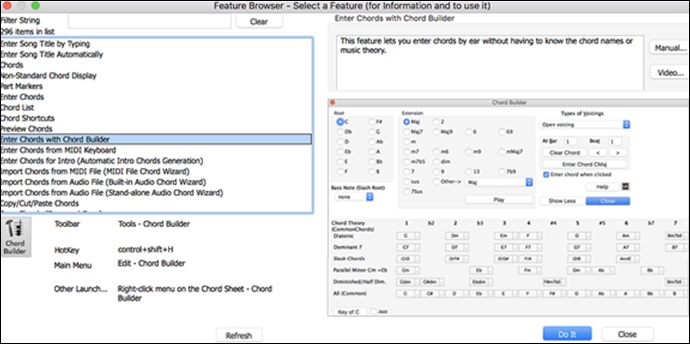 Clicking on the [?] button on the main screen or pressing the / return keys on the Chord Sheet opens the Feature Browser.