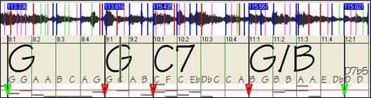 As playback continues in this example (below), we notice that ACW has made its first error approaching Bar 5. Audio Chord Wizard has estimated the tempo of Bar 4 too slow.