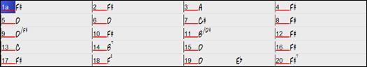 The “part markers” for the file are displayed on the Chord Sheet. For violet.MID, the Style Wizard has found the correct part markers – by looking for drum fills and other signs of a part change – and has assigned substyle “a” to all of them. We will change some of them to “b” later.