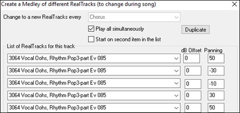 RealTracks create Band-in-a-Box tracks with live audio recordings of top studio musicians and recording artists. These tracks take the place of the MIDI track for that instrument, but can still be controlled just like the MIDI instrument (volume changes, muting, etc.). Best of all, they follow the chord progression that you have entered, so that you hear an authentic audio accompaniment to your song.