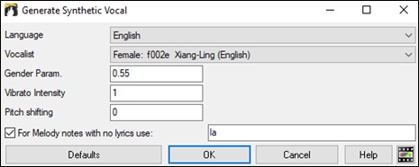 Normally, you would use the auto mode, which does this process automatically for you. When you choose an auto mode, the Generate Synthetic Vocal dialog will open.