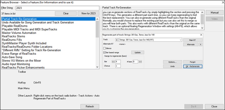 [Forget Recent Riffs Used] allows Band-in-a-Box to “forget” the previous ones so that you can generate using all the available ones. Note that re-generation from a different bar, different track or different song will “forget” the previous re-generations, so you likely won’t need to press this button much, if at all.
