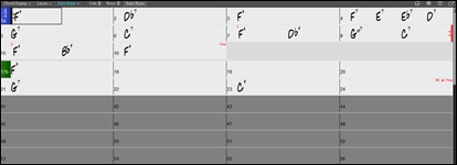 The Chord Sheet is the default window, where you enter chords, rests/shots/holds, and part markers (a, b, through x).