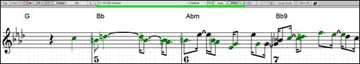 There is also a feature to change the MIDI notes in a region to Playable notes. Select the notes, click on the [PRT] button to, and select Make notes in selected area Playable RT notes from the menu. The selected notes will then become green and be heard during playback. This menu also has options to change the selected notes to RealCharts notes, select all Playable notes, choose a different Hi-Q patch, etc.